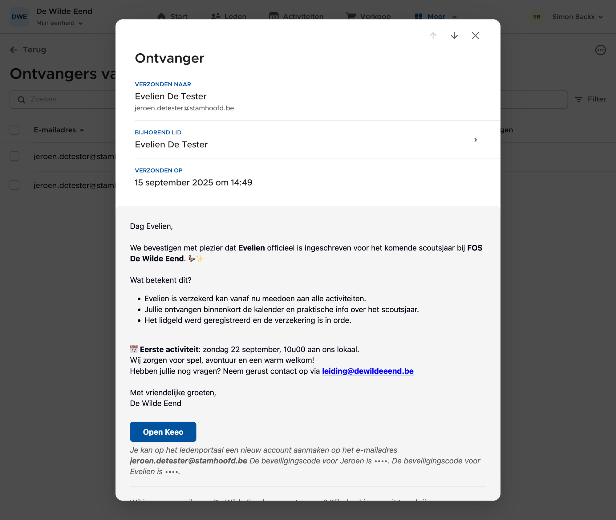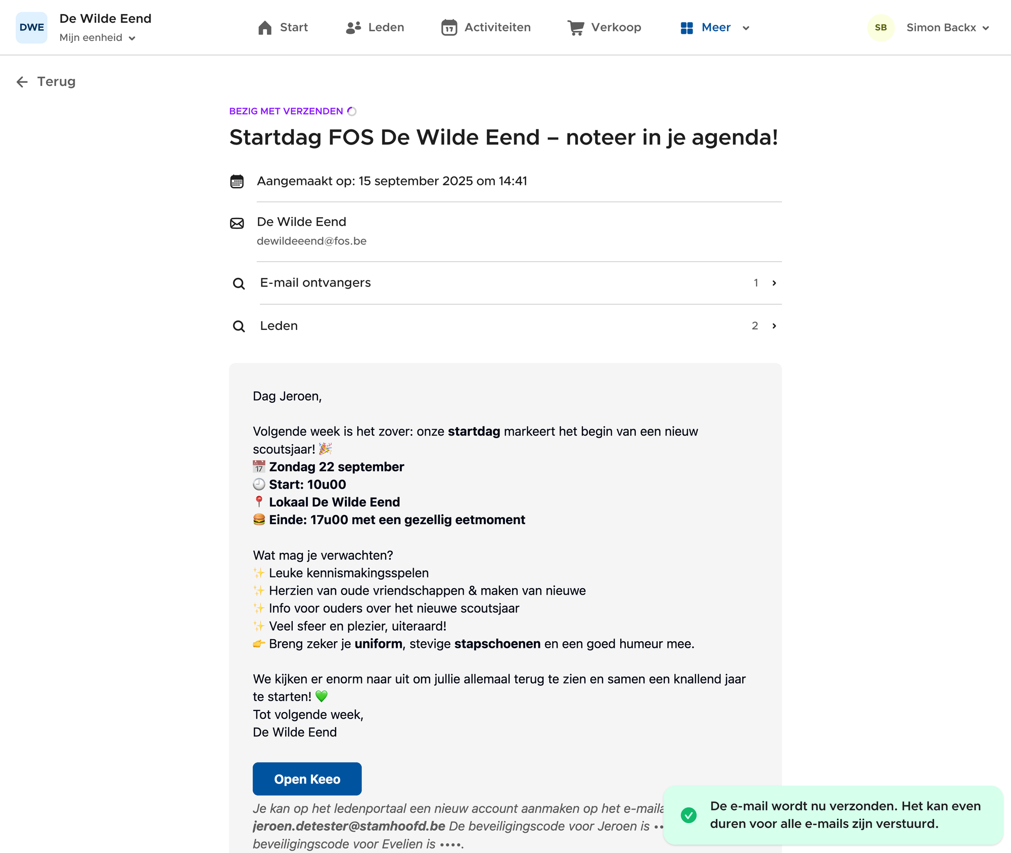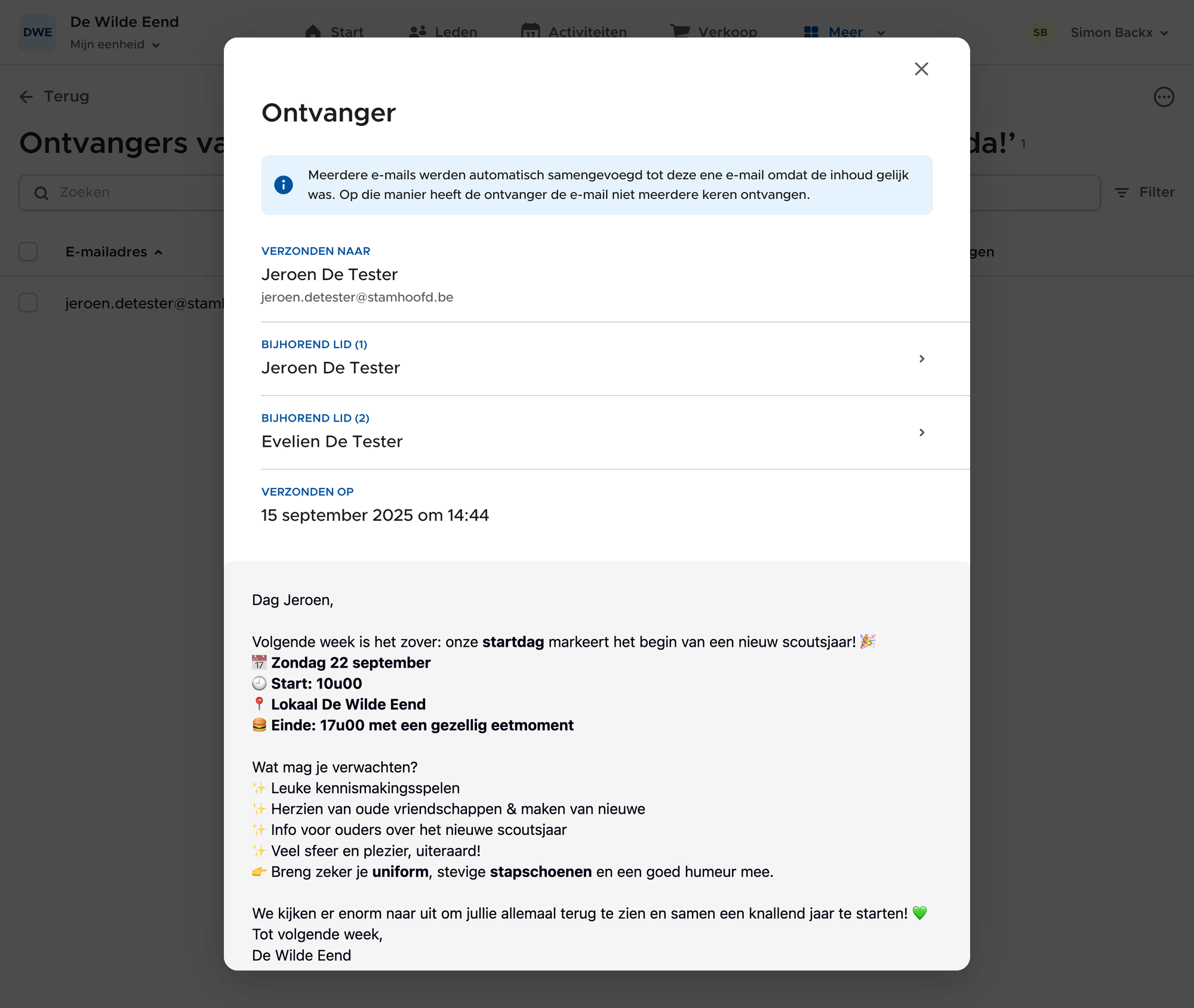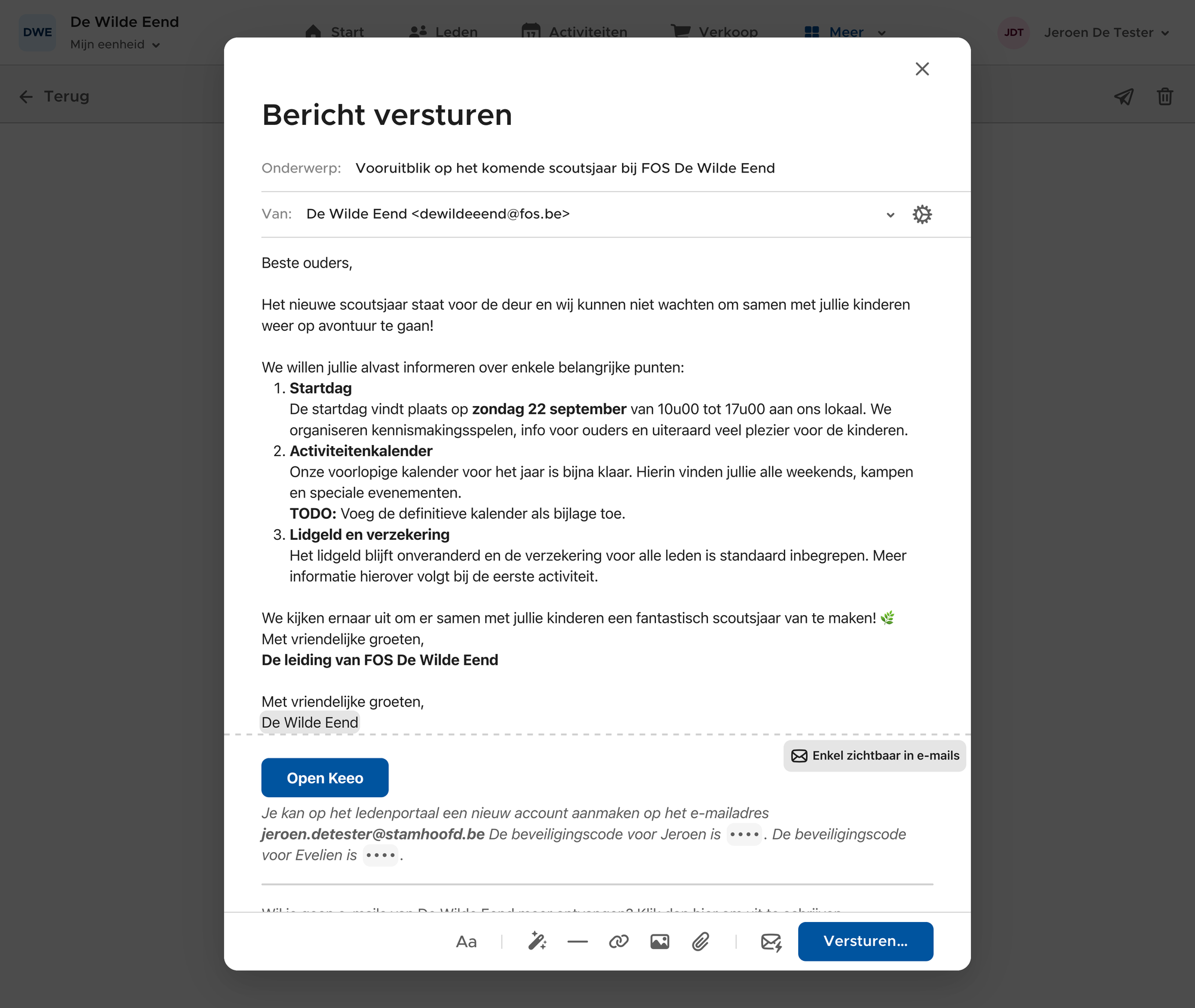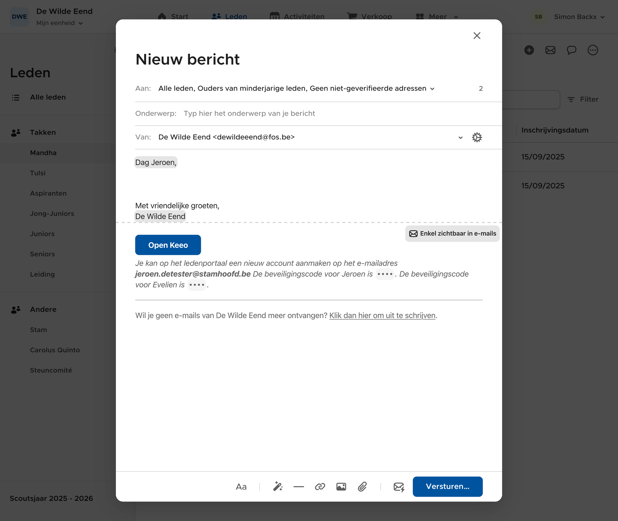 Stuur je exact hetzelfde bericht naar meerdere leden van hetzelfde gezin? Dan is Keeo slim genoeg om maar één e-mail naar elk e-maildres te versturen, in plaats van voor elk lid dezelfde e-mail te versturen naar elke ouder. Dit geldt enkel als je één bericht naar een selectie van leden tegelijk verstuurt. Stel dat je eerst een bericht stuurt naar leeftijdsgroep X, dan hetzelfde bericht naar leeftijdsgroep Y, dan kan Keeo de dubbele e-mails niet detecteren en krijgen ouders uit beide leeftijdsgroepen de e-mail wel dubbel.