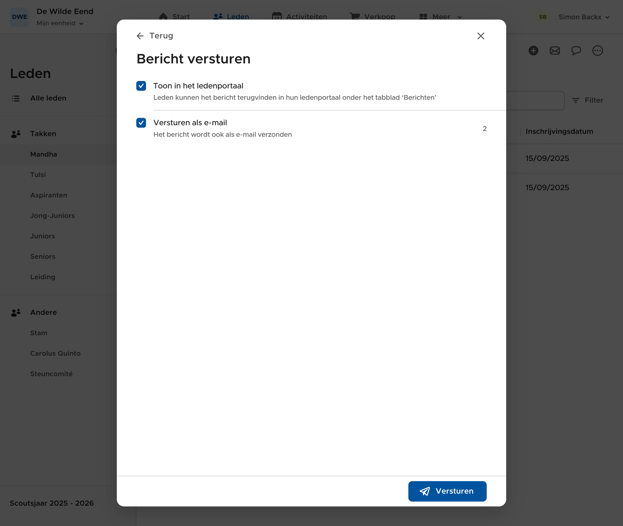 Eenmaal je jouw bericht hebt opgesteld, kan je op 'Versturen...' klikken. In de volgende stap kan je kiezen of je het bericht ook zichtbaar wilt maken in het ledenportaal en of je het wilt versturen via e-mail of niet.