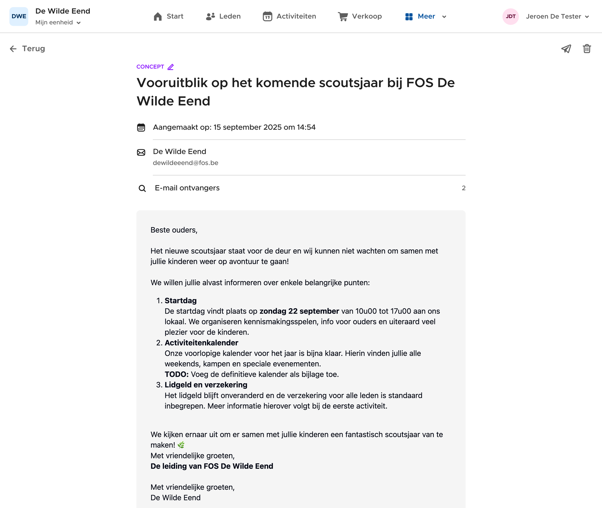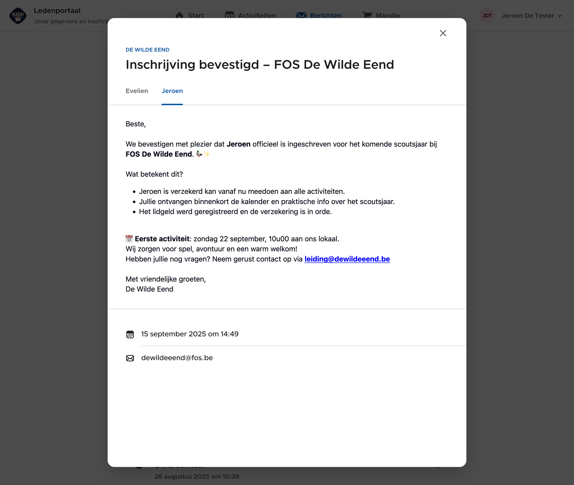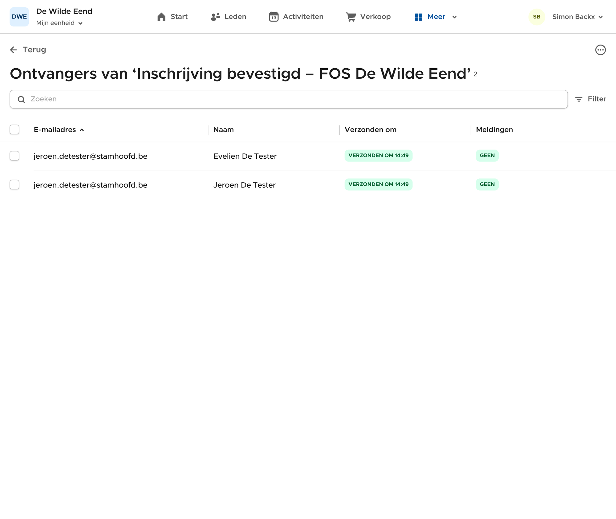 Ga naar de activiteit in het activiteiten tabblad. Vervolgens klik je door naar de ingeschreven leden. Opnieuw kan je hier een bericht versturen via het enveloppe-icoontje bovenaan.
