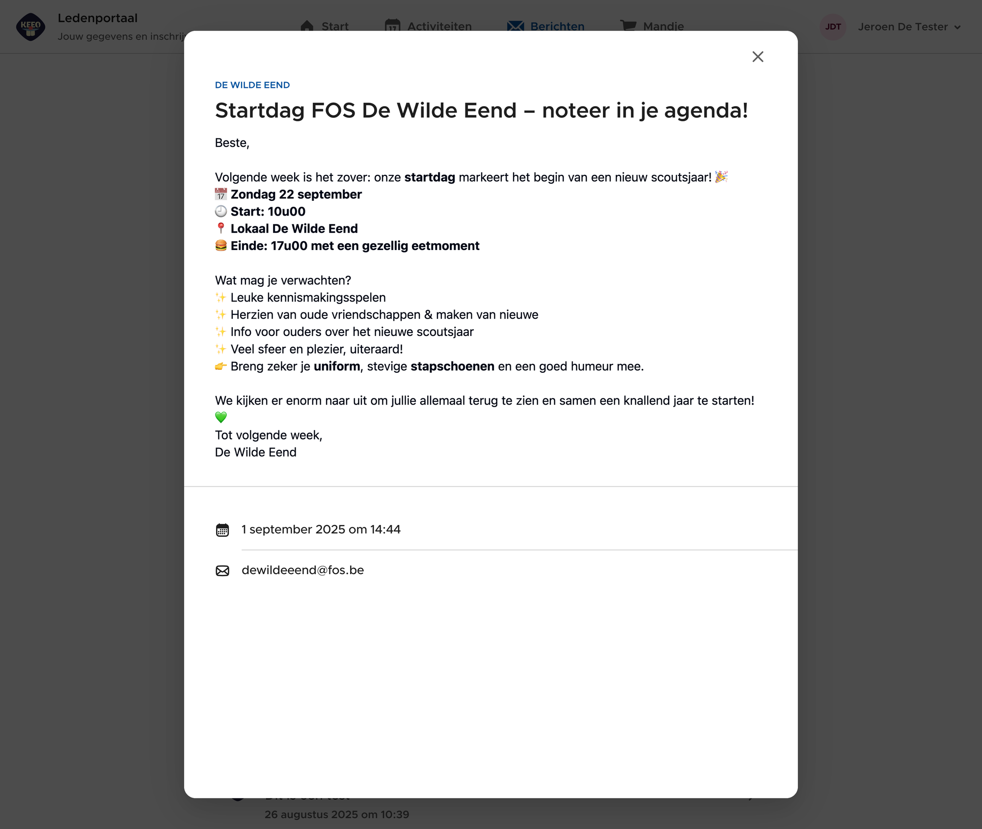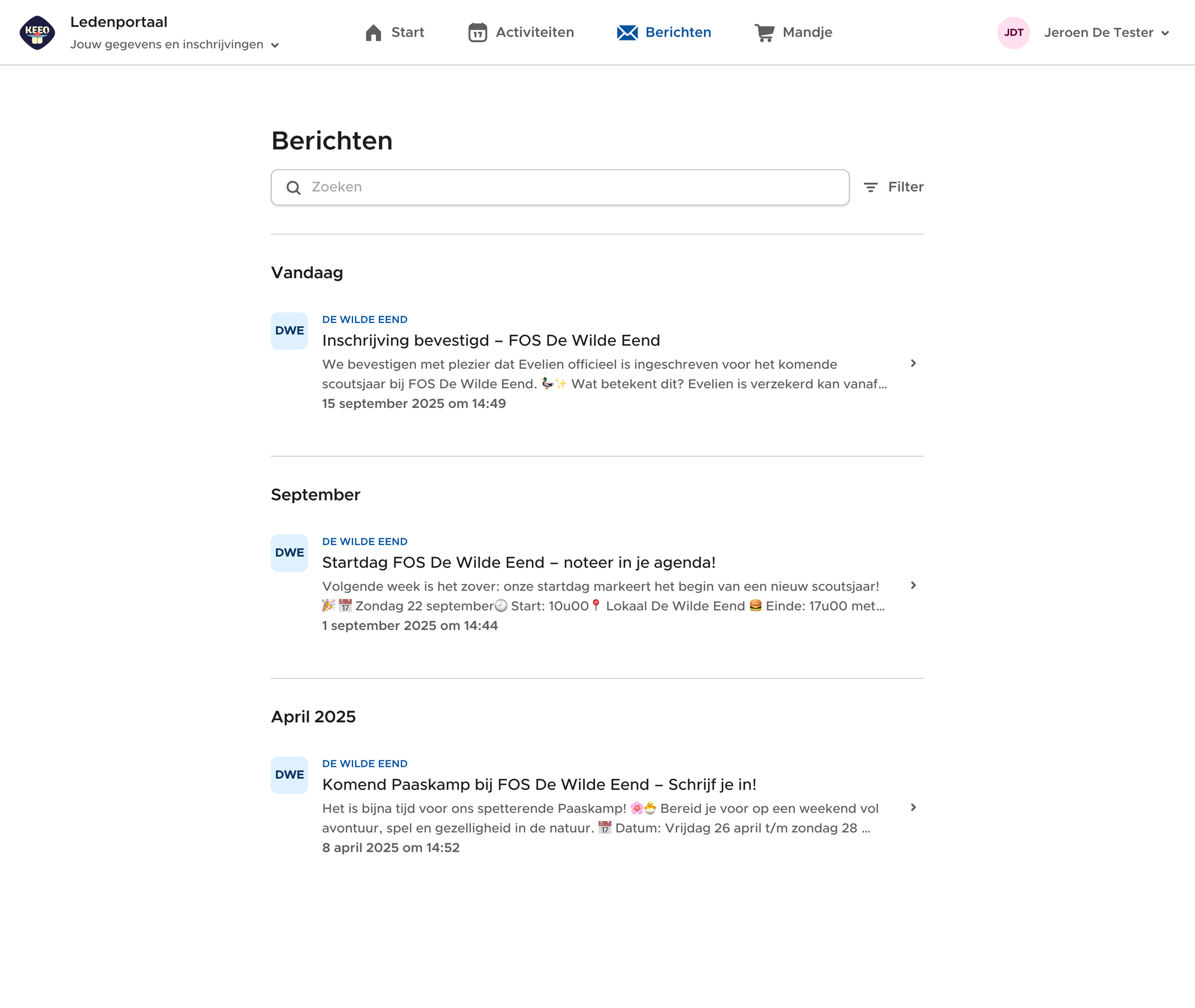 Via het beheerderportaal van je eenheid kan je via Meer → Berichten, alle verzonden berichten raadplegen. Hier kan je bovenaan zoeken op onderwerp, en kan je ook berichten filteren.