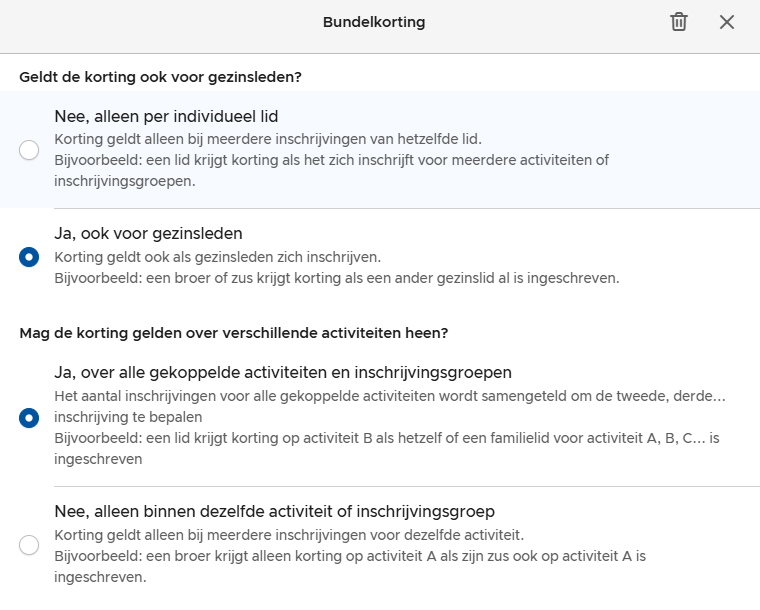 Deze korting kan je op verschillende plaatsen instellen. Ofwel ook via de instellingen van de inschrijvingsgroep/activiteiten of via Meer > Instellingen > Bundelkortingen.